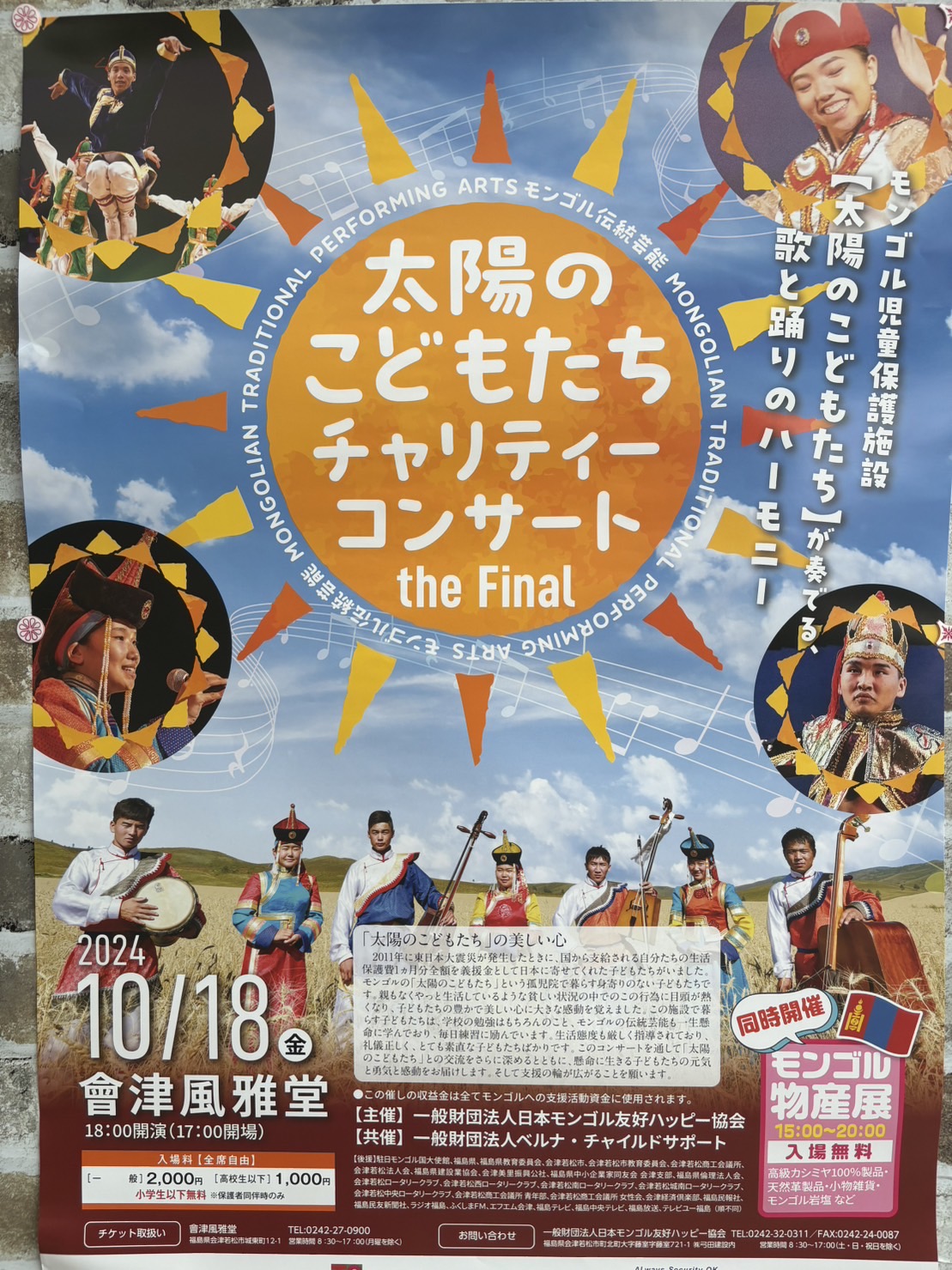 2024年10月18日(金)に、モンゴルの孤児院から子供たちをお招きして、その子たちによる伝統芸能披露のコンサートを會津風雅堂で開催します!私も実行委員として取り組んでいますので、ぜひご参加ください!